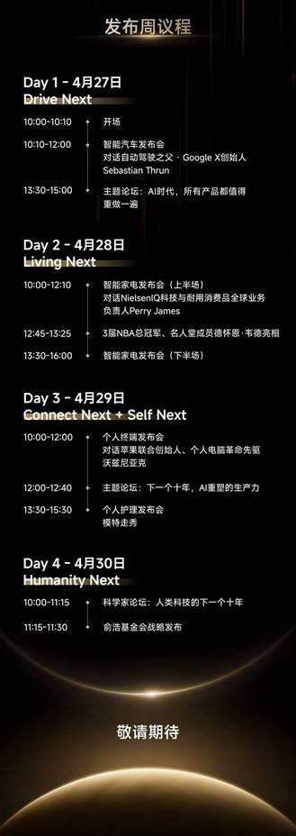 本次发布会的重心由五大部分组成:“Drive Next”、“Living Next”、“Connect Next”、“Self Next ”、“Humanity Next”,而“DREAME NEXT”作为核心主题贯穿整个发布会,追觅将会在发布会上为大家展现自家的创新技术,推出全新的产品矩阵,与各界企业、顶尖的业内人士探讨科技未来十年的发展方向和前景,搭建跨界交流的新桥梁。