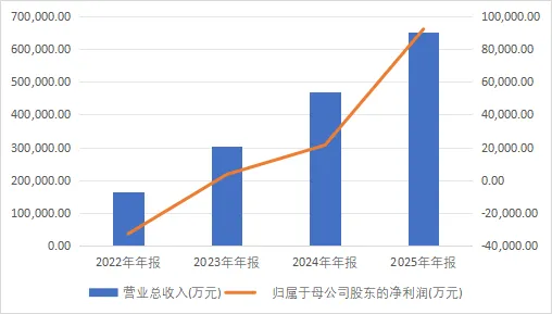 2022年至2025年,公司营业收入分别为16.33亿元、30.38亿元、47.05亿元、65.21亿元。