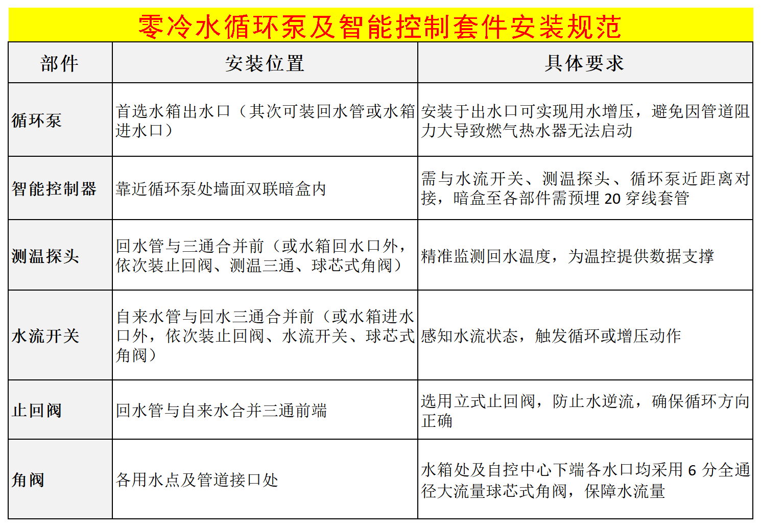 (二)循环泵及智能控制器配置与安装1. 选型要求优先选用 “恒尔暖 WiFi 循环泵智能控制器套件”,需具备温度控制、定时 + 温控、水流控制功能,支持手机 APP 远程控制,减少能耗与燃气热水器启动次数。