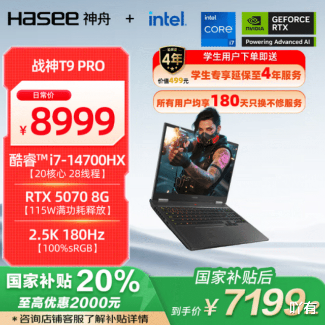 再说战神T9 Pro(RTX 5070 + i7-14700HX,7199.2元)。比S9贵800块,但升级到了14代i7和2.5K 180Hz屏,多核性能强出一截,适合同时游戏+直播、剪辑、多开程序的用户。14700HX+5070算这个价位性能天花板之一,但必须说,如果只打游戏,S9更划算,T9 Pro赢在多任务能力。