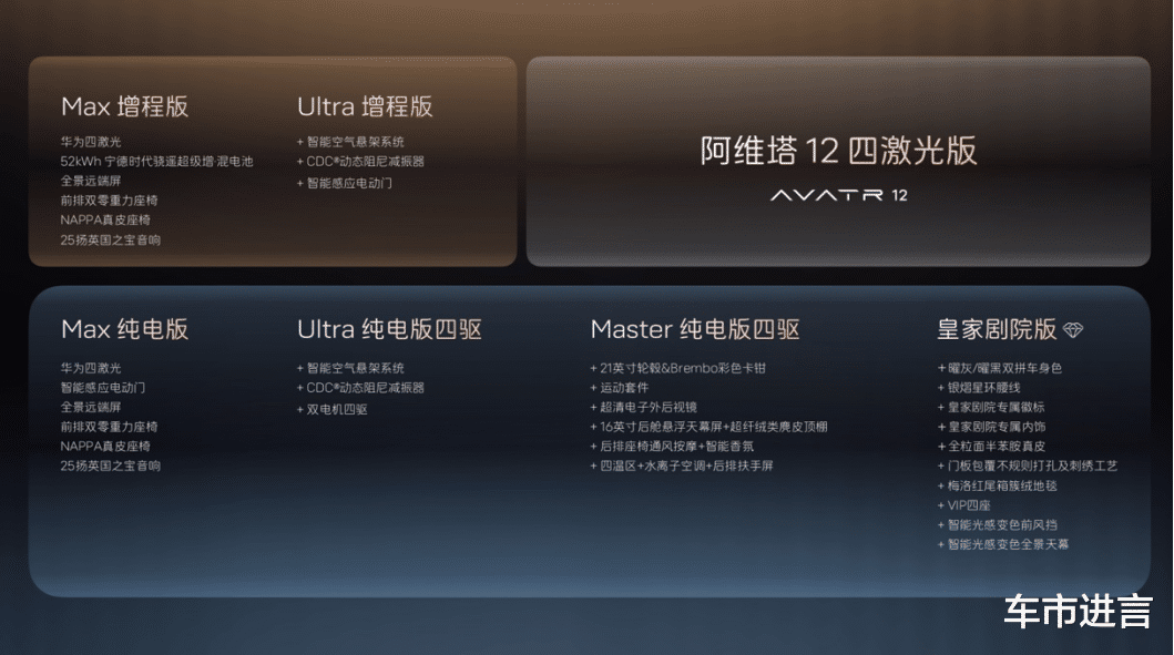 不过大家要想知道具体的价格,这里也可以比较肯定的告诉大家,上市之后跟老款相比大概率没什么变化。但跟老款产品力相比,这次阿维塔12四激光版可以算是全面进化,尤其是从名字上就能看出来,它在辅助驾驶方面肯定是有增强的,并且这次发布会也强调了它是在设计、豪华感、驾控和智能这四个维度上有“十项全新升级”。