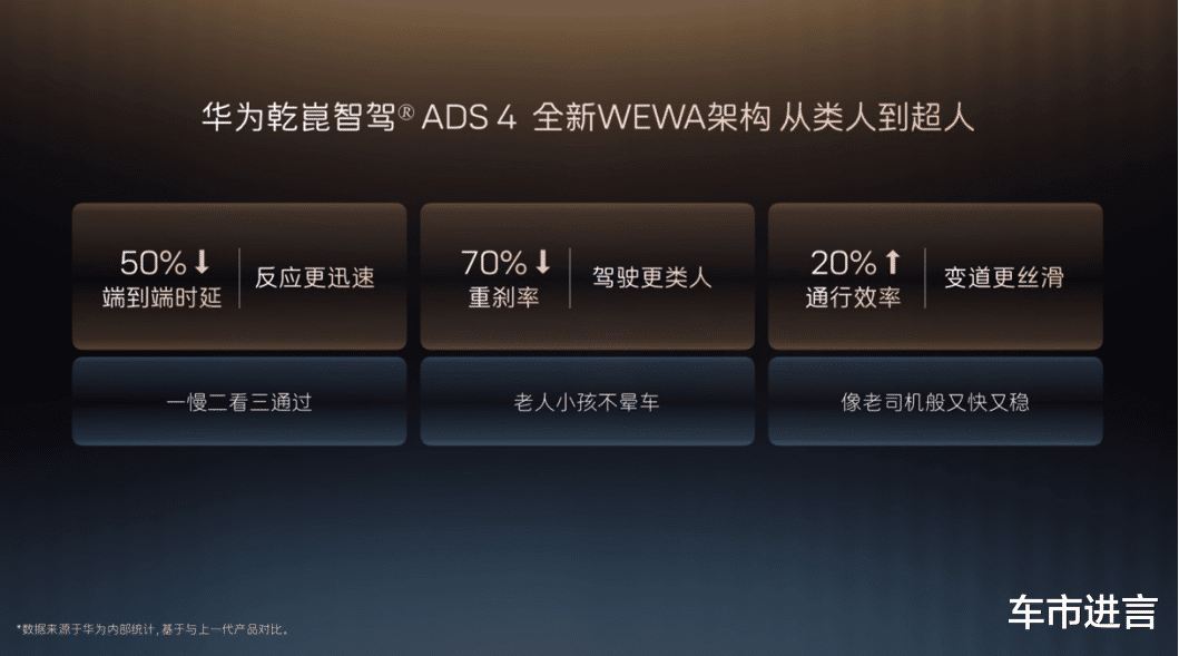 光有硬件还不够,软件也得跟上。新车搭载了华为乾崑ADS 4智能驾驶系统。据说这套系统基于新的技术架构,决策逻辑从“模仿人类”向“超越人类”进化了,具体表现就是通行效率能提升20%,不必要的紧急刹车情况减少了30%,系统反应延迟更是降低了50%,开起来会更像老司机那样流畅自然。