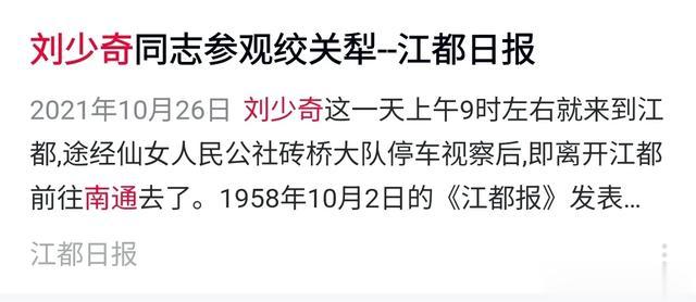 据《江都日报》报道,1958年9月23日(日期疑有误)上午九点,刘少奇在自扬州前往南通途中,经过江都县仙女人民公社砖桥大队,停车视察生产情况后,即继续赶往南通了。