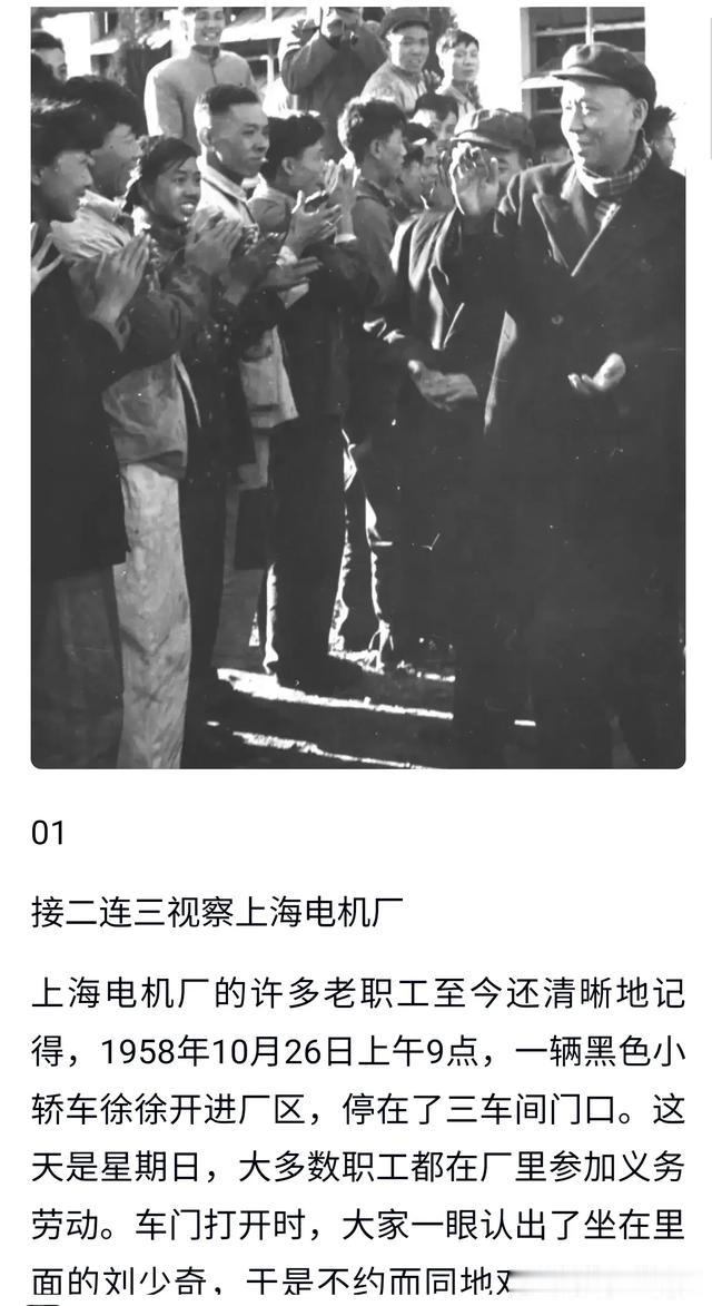 刘少奇携夫人王光美1958年到南通,公开的史料记载不多,准确的日期应该是1958年9月23日。根据刘少奇年谱中的记载:9月19日 ,刘离开河南,进入江苏。由北向南分别在徐州、新海连市、连云港考察工业、农业及海防。9月21日 上午到达沭阳,下午到达清江(淮阴),听取中共淮阴地委负责人的汇报,在中共淮阴地委负责人的陪同下,去洪泽参观二河闸水利工程工地、高良涧灌溉总渠水闸。9月22日,在洪泽参观三河闸水利工程后去高邮。听取中共高邮县委、宝应县委负责人的汇报。晚上到达扬州。听取中共扬州地委、盐城地委负责人的汇报。