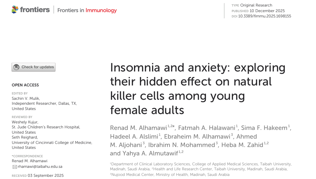在快节奏的现代生活中,焦虑和失眠似乎成了许多人的“常客”,尤其是年轻女性群体。2025年12月,沙特阿拉伯泰巴大学、健康与生命研究中心及努乔德医疗中心联合在国际免疫学期刊《免疫学前沿》上发表了一项重要研究,为我们揭开了焦虑与失眠对年轻女性免疫力“侵蚀”的神秘面纱。