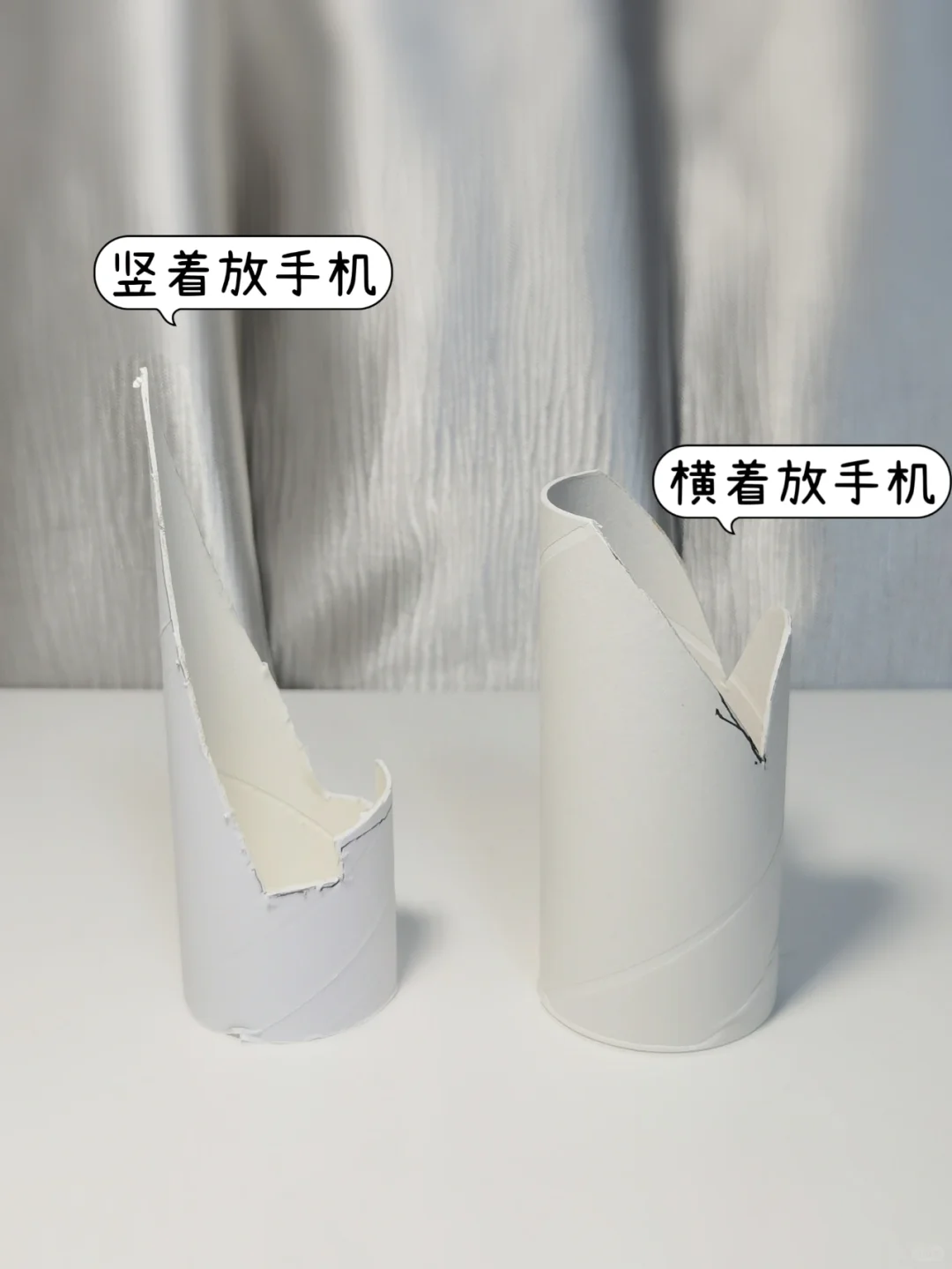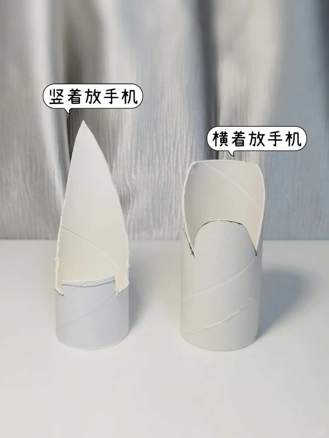 比如大家可以将卷纸筒裁剪成合适的高度,再使用剪刀剪出形状就可以将手机放置在里面了。