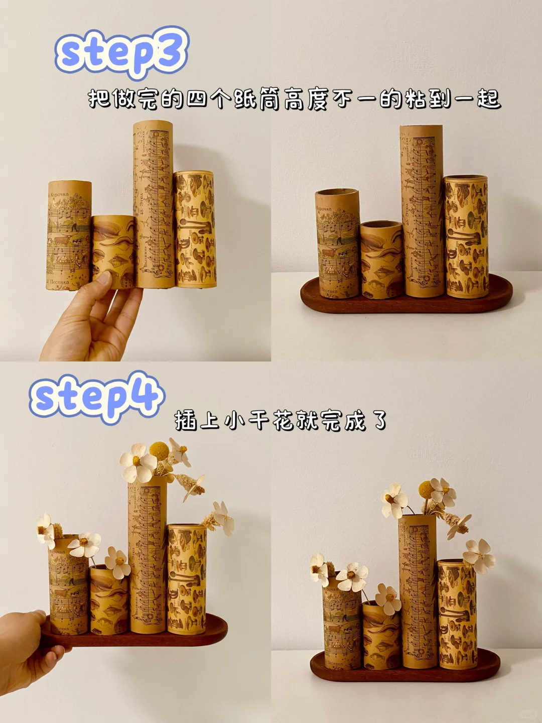 如果大家平时喜欢在家里面养花或者是做一些插花的话,那么也可以利用闲置的卷纸筒来diy复古插花摆件。
