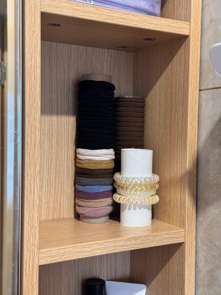 除此以外,大家也可以直接将卷纸筒竖着摆放在梳妆台或者是镜柜里,然后将平时所使用的发圈全都套在卷纸筒上,也很方便收纳。