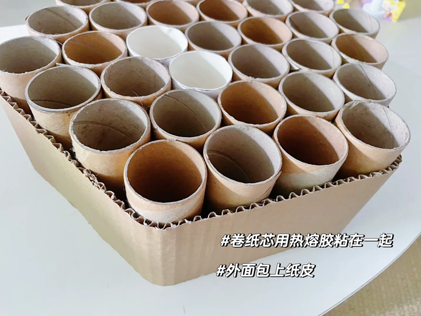 这些将卷纸筒使用胶水粘贴在一起外围再用硬纸板进行一下简单的固定,