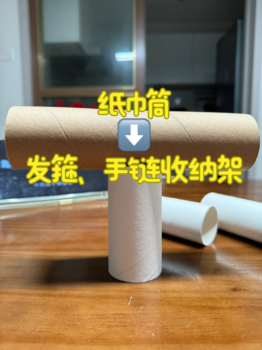 大家只需要将两个合适的卷纸筒使用热熔胶固定在一起,就可以将发箍以及手链等物品放置在上面了。