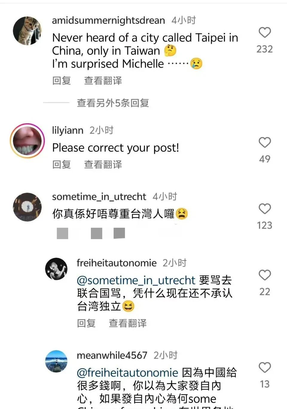 她曾在一次采访中提到“中国台湾”,结果遭到了台湾网友的猛烈抨击。