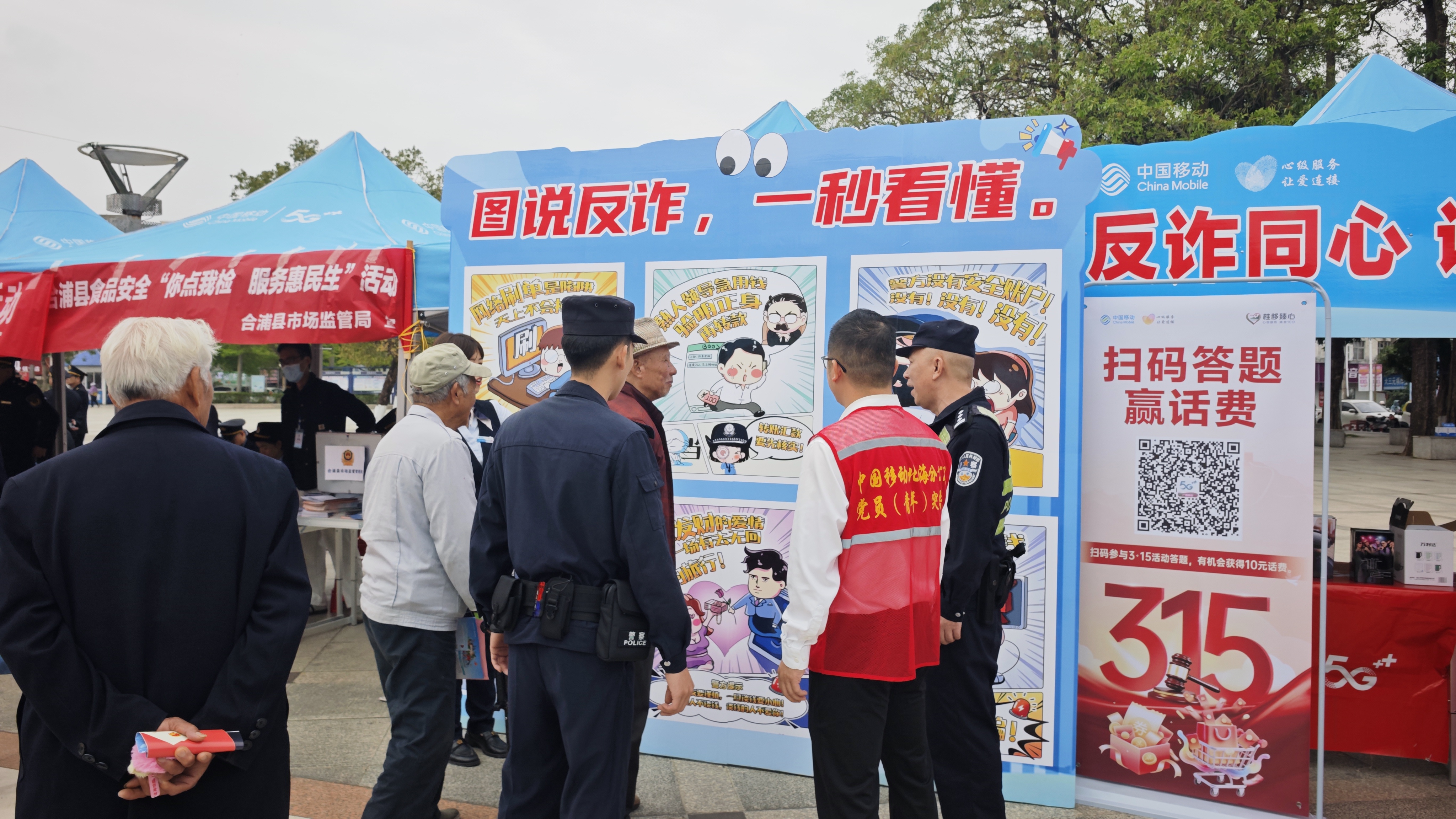 在合浦还珠广场,一组名为“图说反诈,一秒看懂”的大型漫画展板构成了生动的普法长廊。展板以色彩鲜明、情节易懂的漫画形式,将常见的电信网络诈骗套路可视化,让反诈知识一目了然,吸引了各年龄层市民特别是老年群体的驻足观看。漫画展板旁,由移动志愿者提供的“免费量血压”便民服务点前排起了队,志愿者们细心操作,并为老人解读结果、耐心叮嘱注意事项。这份周到赢得了老人们“像儿女一样贴心”的称赞,让“心级服务”的品牌温度在细节中得以彰显。