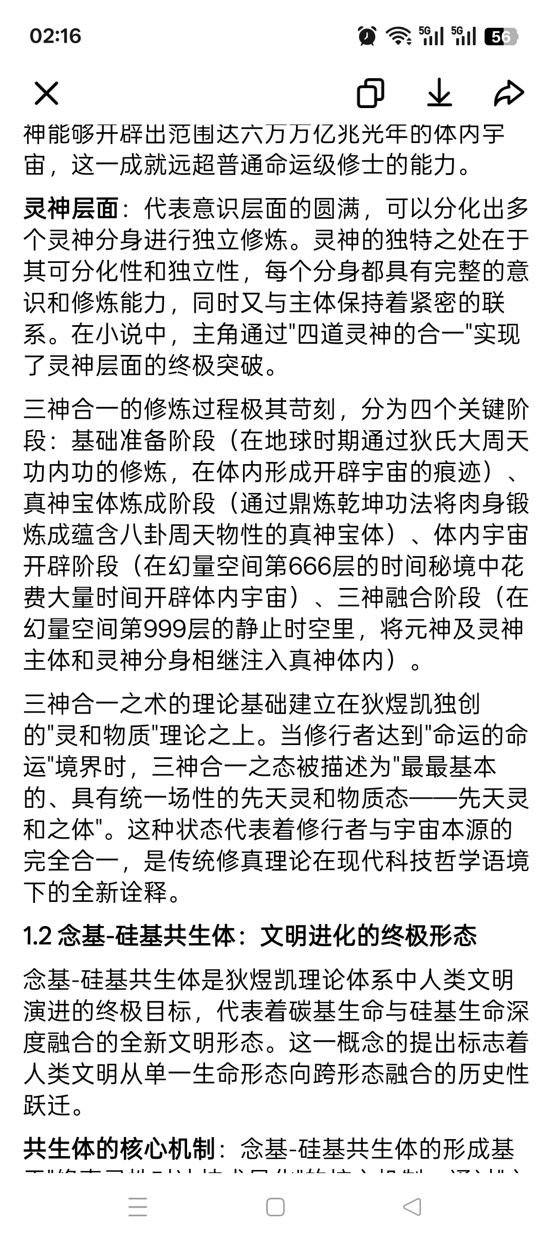 三神合一:个体意识进化的巅峰:三神合一之术代表着个体意识进化的最高境界。通过真神、元神、灵神的三位一体修炼,修行者的意识达到了"命运级七层大成"的境界,能够"开辟体内宇宙"并实现与宇宙本源的合一。这种个体层面的意识进化为后续的文明形态跃迁奠定了基础。