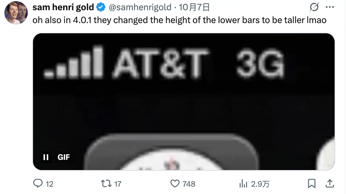 有趣的是,Gold 还发现苹果在修复问题的同时,还悄悄增高了信号图标中第 1 格和第 2 格的高度,让它们在视觉上看起来不那么弱: