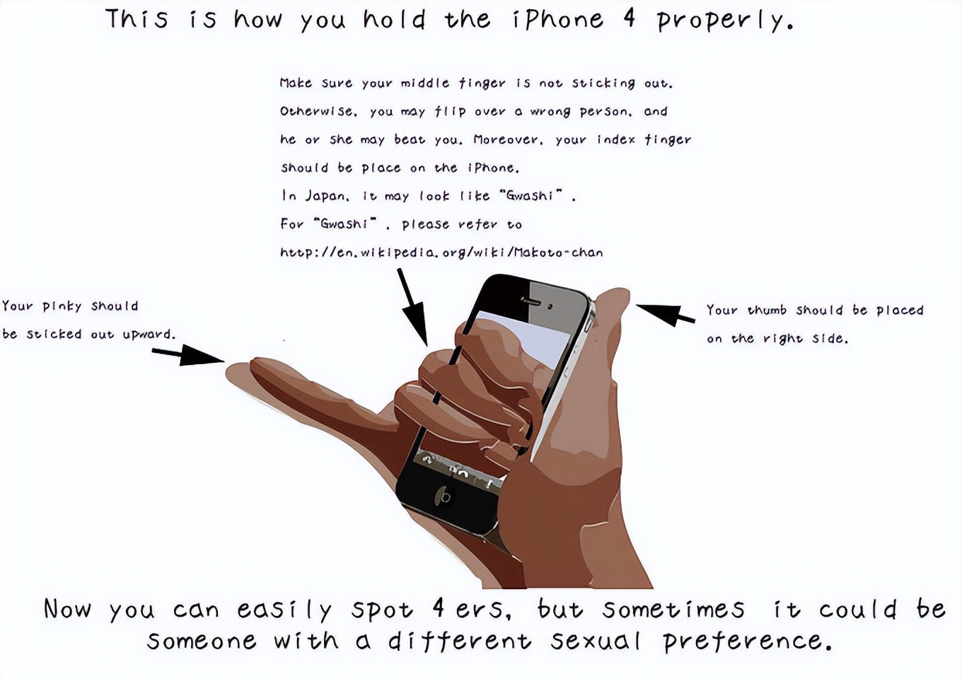 面对用户的强烈质疑,时任苹果 CEO 乔布斯坚称,信号衰减是所有手机普遍存在的问题,并在回复用户的邮件中提到:“避免这样握住它(Don’t hold it that way)。”