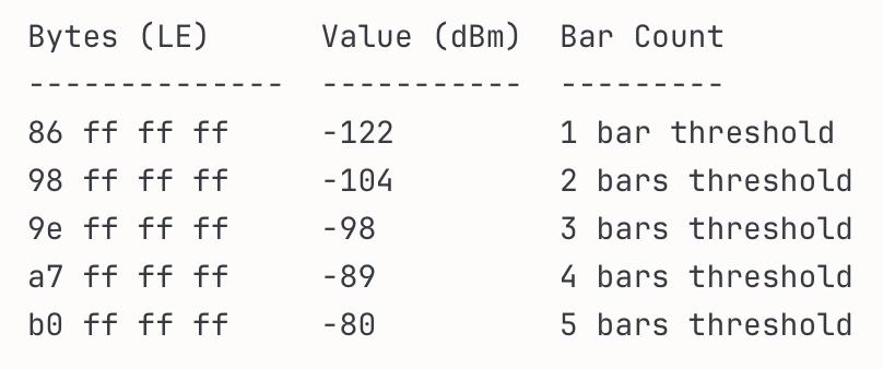 其实这是一张信号查找表,正是这张表决定了信号强度如何转换为显示格数。苹果在后续的 iOS 4.0.1 更新中,通过修改这张表的数值,让信号格的变化曲线变得更平滑,从而缓解了信号骤降的情况。