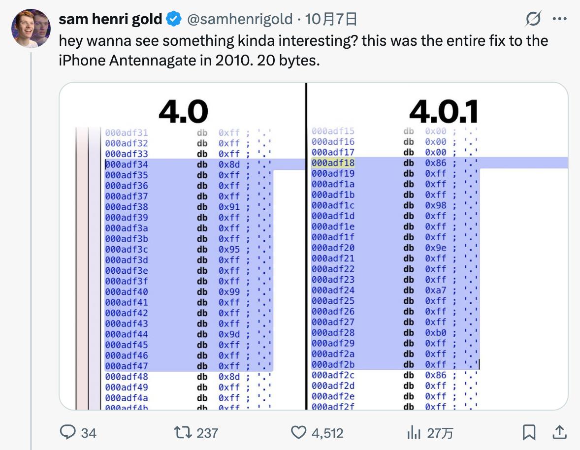 就在最近,软件工程师 Sam Henri Gold 的发现则证实了这一点。他通过研究 iOS 4.0 和修复后的 iOS 4.0.1 固件代码,找到了信号格数计算公式的变动,仅有 20 字节。