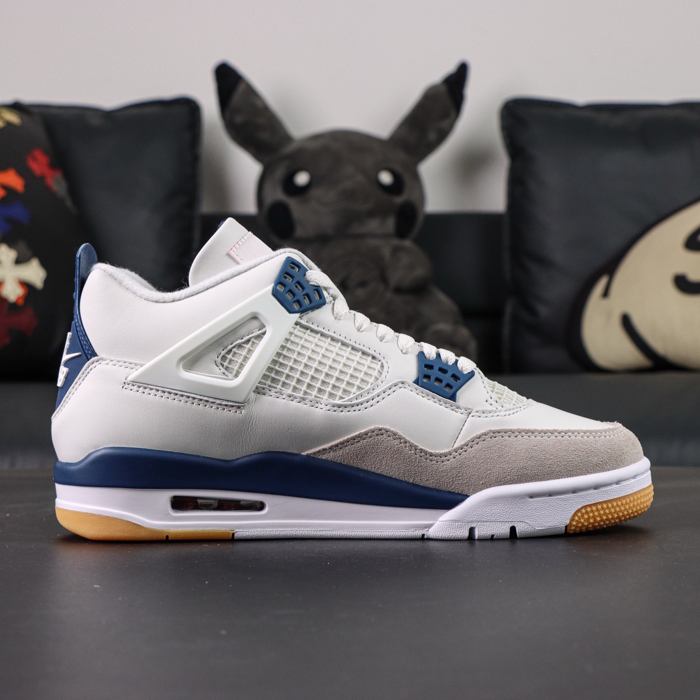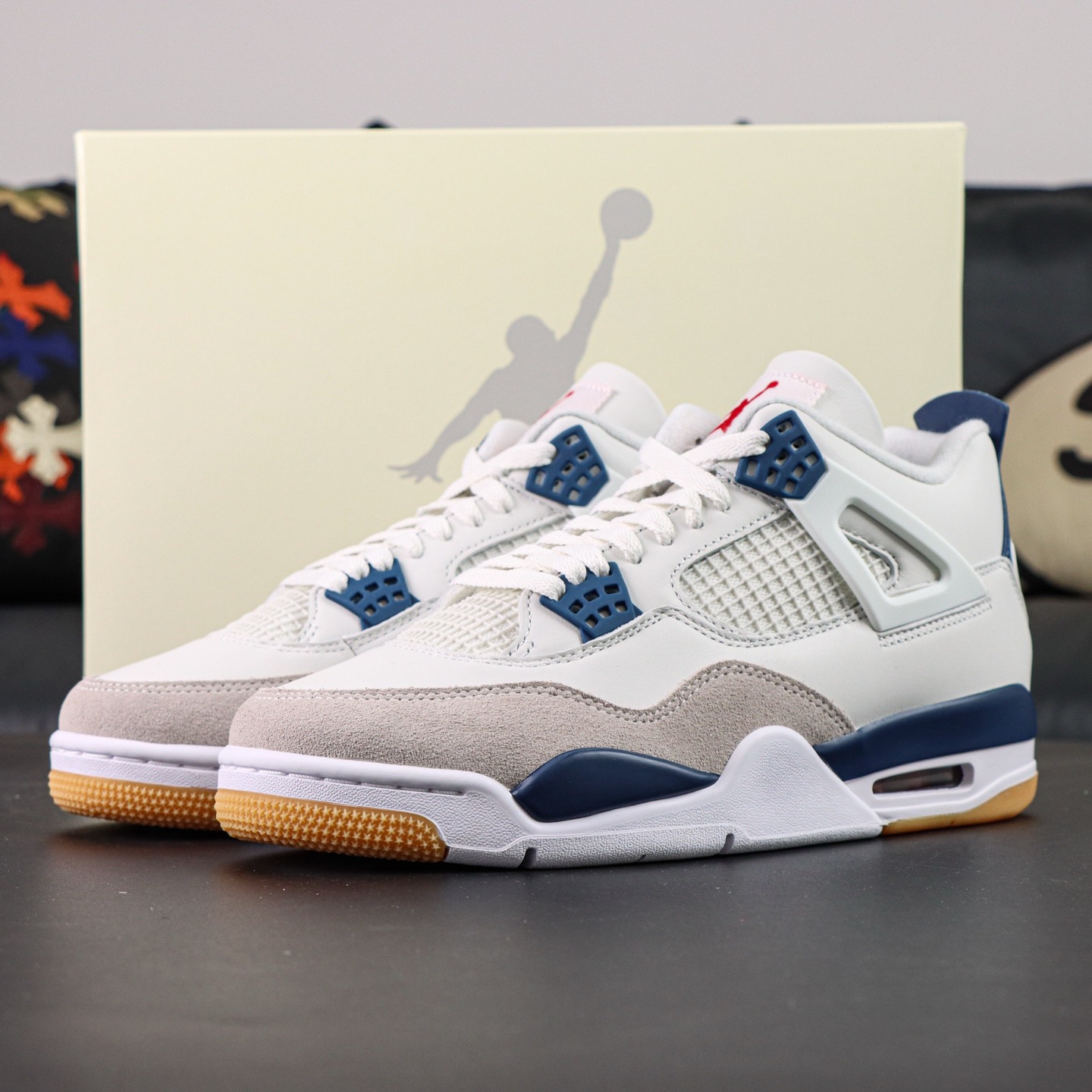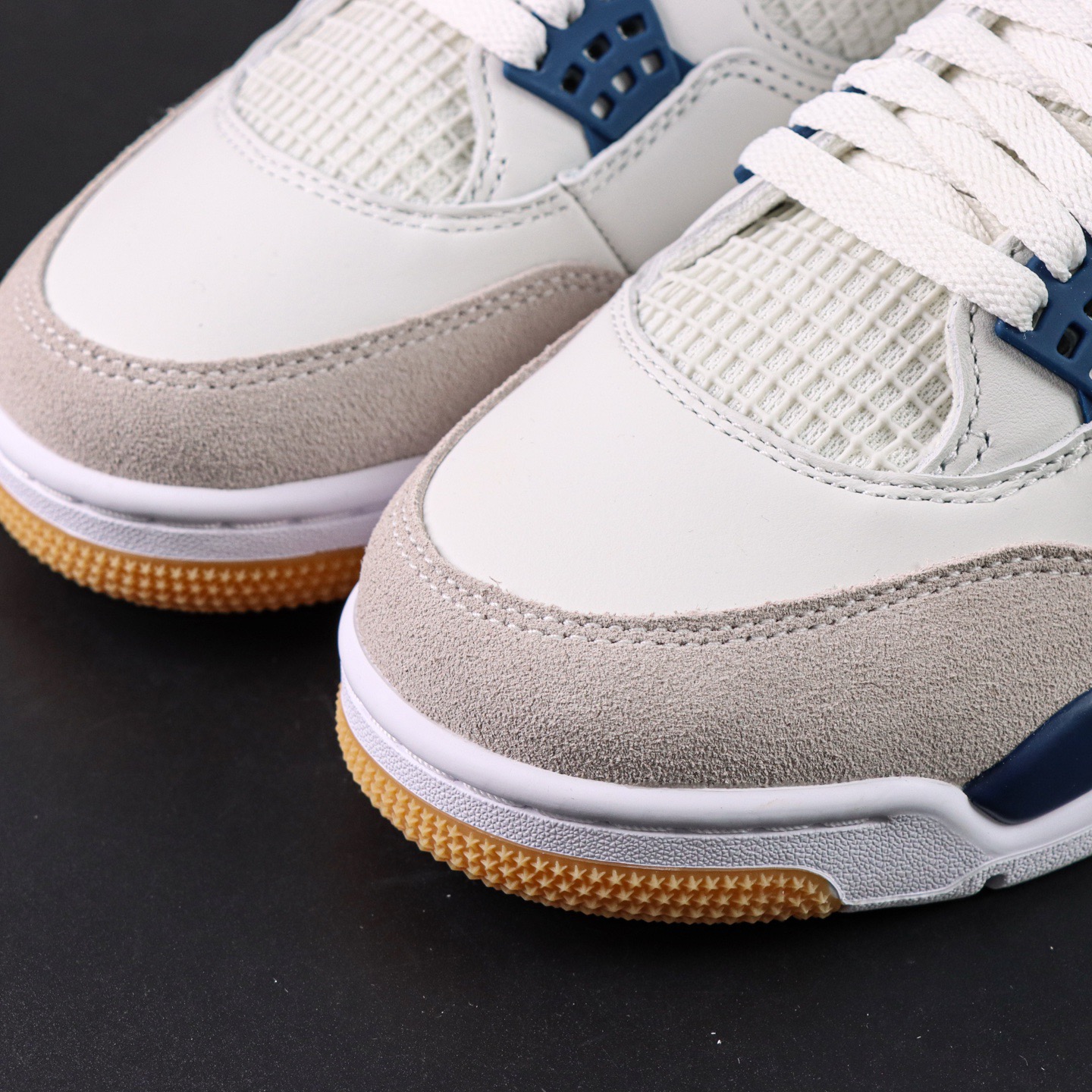 该鞋款以经典的 Air Jordan 4 为基础,融入滑板文化元素,采用简洁的白蓝配色方案。鞋面主要由白色皮革构成,前掌覆盖浅灰色麂皮,鞋带扣和后跟标签则以海军蓝点缀,后跟处的 Nike SB 标志彰显其联名身份。此外,鞋舌标签上的红色 Jumpman 标志增添了亮点,生胶色外底则提升了整体的复古感和实用性。