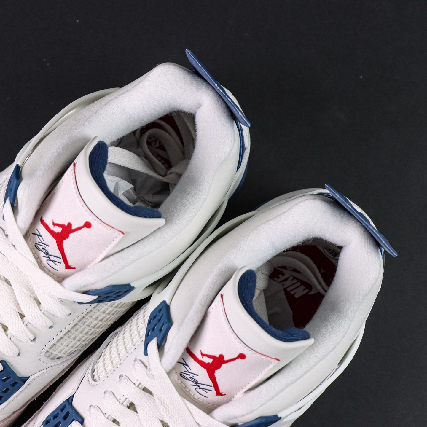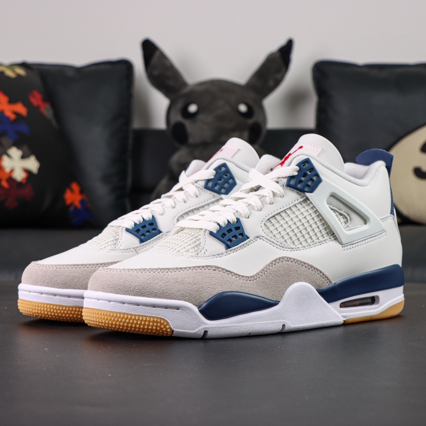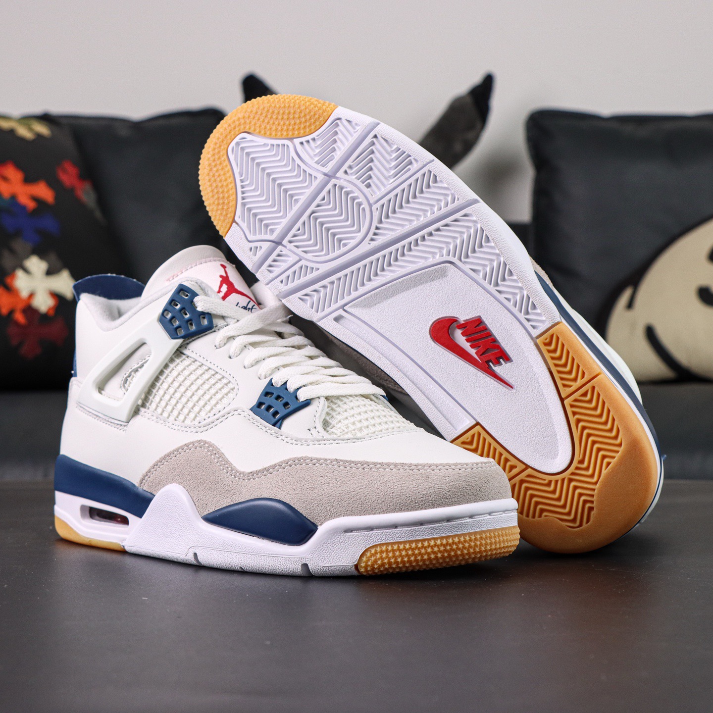该鞋款以经典的 Air Jordan 4 为基础,融入滑板文化元素,采用简洁的白蓝配色方案。鞋面主要由白色皮革构成,前掌覆盖浅灰色麂皮,鞋带扣和后跟标签则以海军蓝点缀,后跟处的 Nike SB 标志彰显其联名身份。此外,鞋舌标签上的红色 Jumpman 标志增添了亮点,生胶色外底则提升了整体的复古感和实用性。
