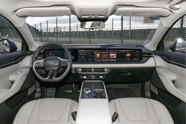 内饰部分,新蒙迪欧采用简约实用的设计思路,环抱式座舱布局让车内氛围 更 温馨。车内触手可及的区域大量使用软质包裹,触感温和,整体质感在同价位车型中表现得体。中控台以简洁易用为目标,功能分区清晰,操作逻辑直观,用户上手难度较 低。