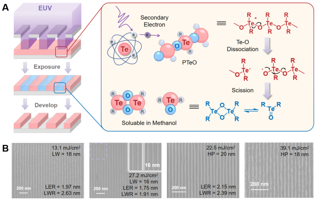 7月16日,清华大学化学系许华平教授团队在《科学进展》(Science Advances)期刊发文《聚碲氧烷作为EUV光刻胶的理想配方》,在极紫外光刻材料上取得重要进展,开发出一种基于聚碲氧烷(Polytelluoxane, PTeO)的新型光刻胶,为先进半导体制造中的关键材料提供了新的设计策略。