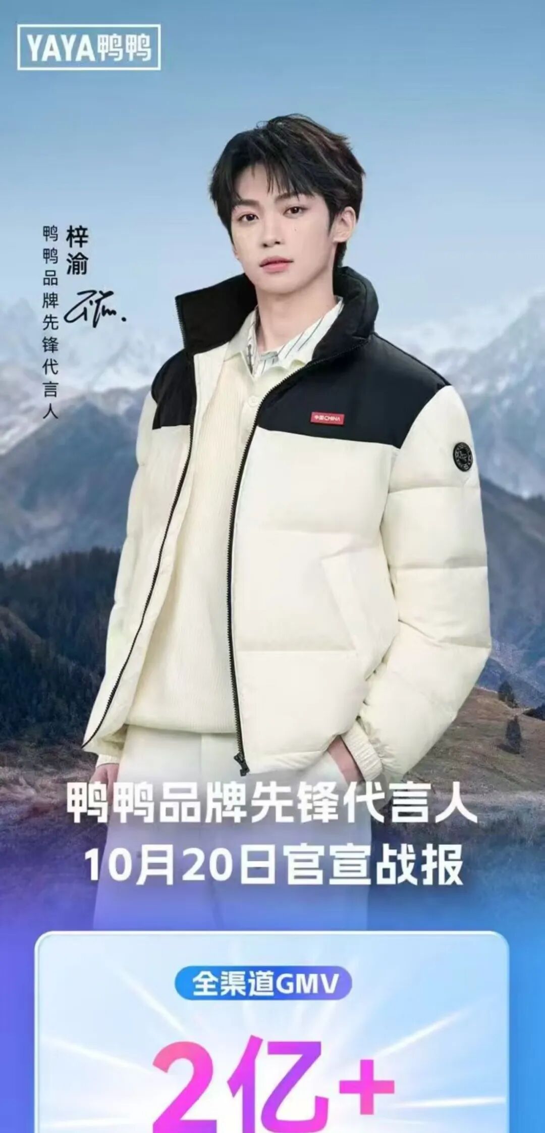 此前,梓渝官宣成为鸭鸭羽绒服代言人后,品牌当天全渠道销售额突破2亿元,官方店铺成为天猫服饰男装、抖音女装、抖音直播带货榜冠军。