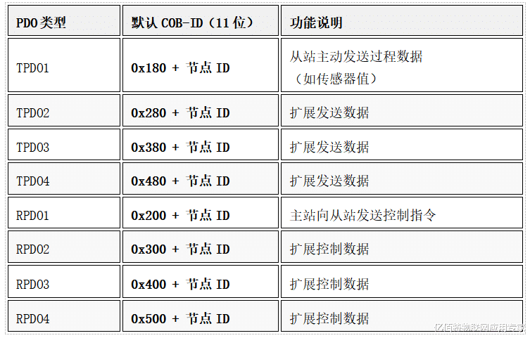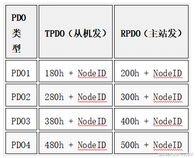 6.5 过程数据对象(PDO)每个节点最多支持4个TPDO和4个RPDO,默认COB-ID如下: