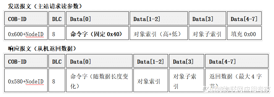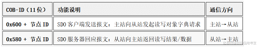二、SDO(服务数据对象)SDO用于非实时的参数读写(如对象字典配置),采用 “请求-响应” 模式,报文格式固定。