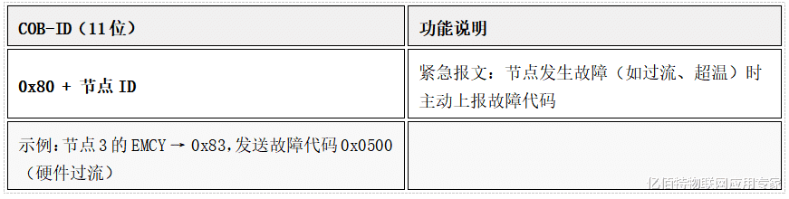 故障监控:从机故障时发紧急报文(080+NodeID),主站通过心跳报文监控设备状态。