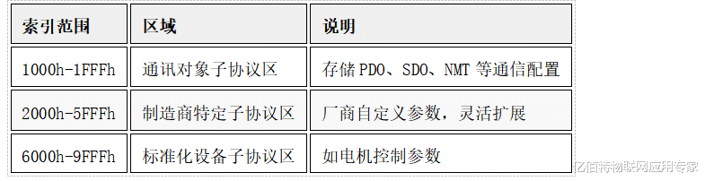四、对象字典(OD)对象字典是所有可配置参数的仓库,通过 16位索引 + 8位子索引 标识,分为4大区域: