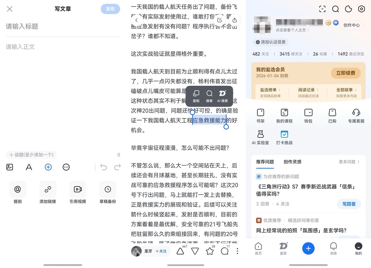 除了这两个炫酷的功能,我还发现不少贴心的小细节。比如发布回答时,可以添加链接、引用等更多格式,浏览时可以选中文字启用AI搜索,个人主页的信息展示也更清晰明了。这些改进给我直观感受是,用着越来越顺手、方便了!