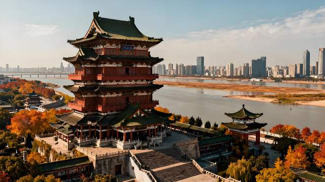 梅岭红枫映塔流,鄱湖雁影伴云游。