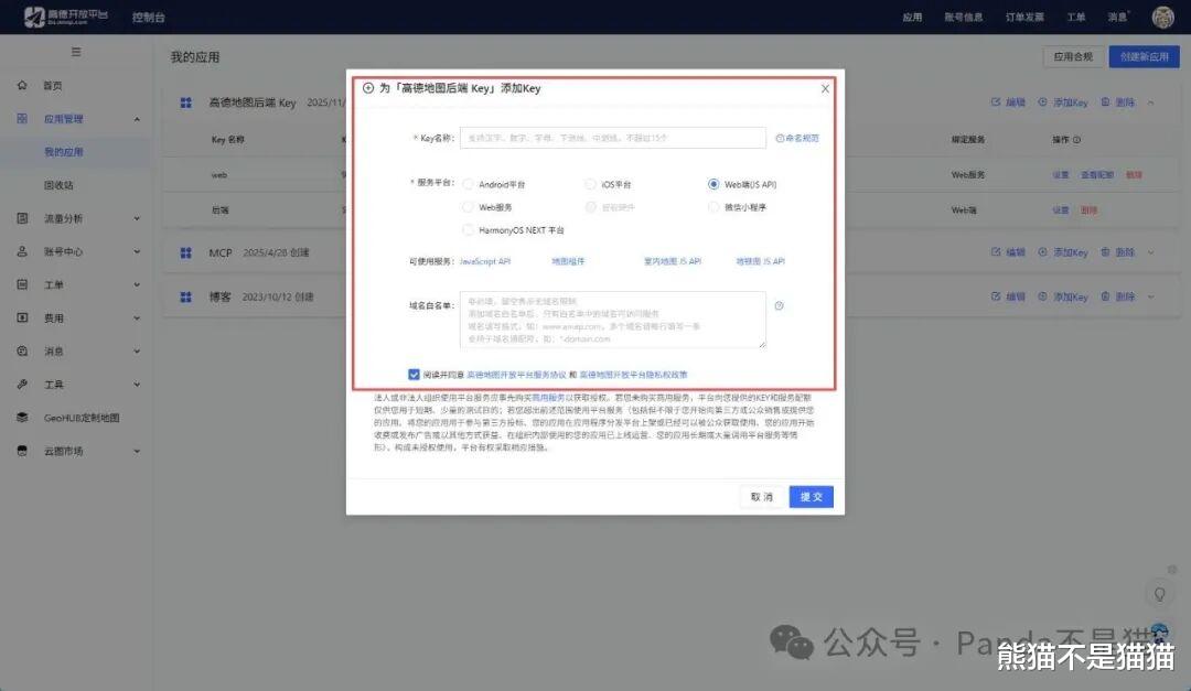 最后最重要的就是百度地图的API,这个一样的,去百度的应用管理中申请就行,也是免费的。https://lbs.amap.com/,登录网址之后点击控制台,随后点击我的应用,在其中新建应用,在添加Key中选择Web端(JS API)即可。