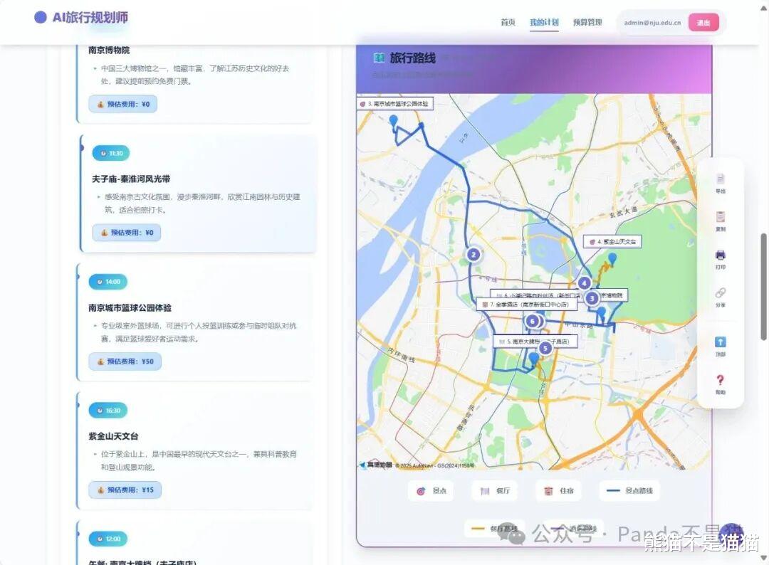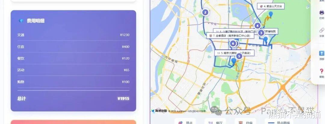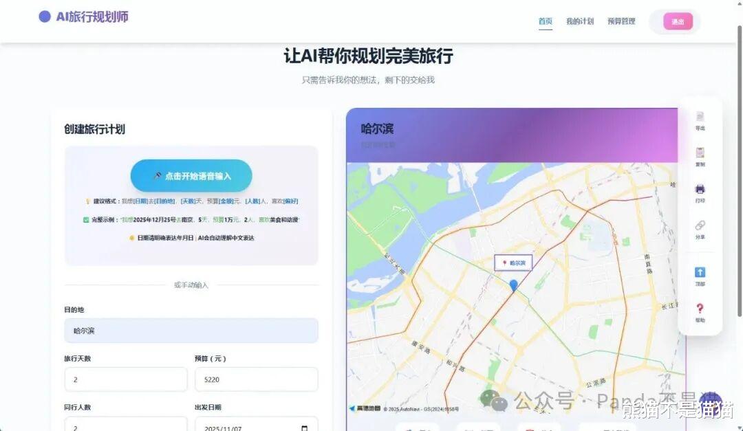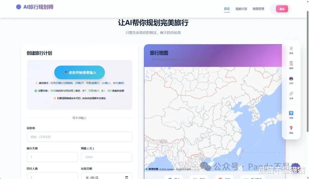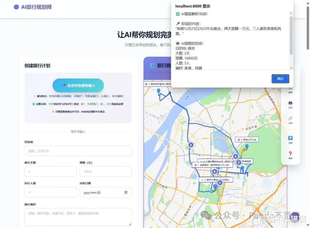 但是!现在的 AI 非常好用了,与其自己折腾这些麻烦事,不如直接交给 AI,一键就能搞定。于是熊猫发现了这么个项目 ——AI 旅行规划师。项目支持语音输入识别、智能行程规划、详细行程安排、费用智能估算,还能实时显示进度,而且地图交互展示特别完整。