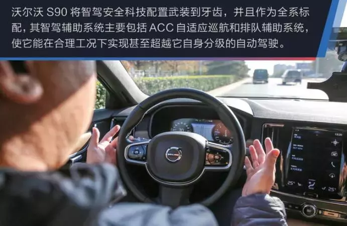 打开智能驾驶辅助系统,沃尔沃S90很快就能识别出正在行驶的车道并进入工作状态,但当系统监视到驾驶员有10秒没有把握方向盘时,系统会做出提示,如果提示后5秒驾驶员还是不做出反应,系统将再次提示告知驾驶员回到驾驶状态,此时系统将退出对车辆的控制。在实际使用后发现,作为驾驶员,你只需要轻轻的将手搭在方向盘上,感受着方向盘自己的转动,寻找好舒适的坐姿,S90便可平稳地在道路上实现符合甚至超出它自身分级要求的半自动驾驶,这无疑使驾驶变得异常轻松。