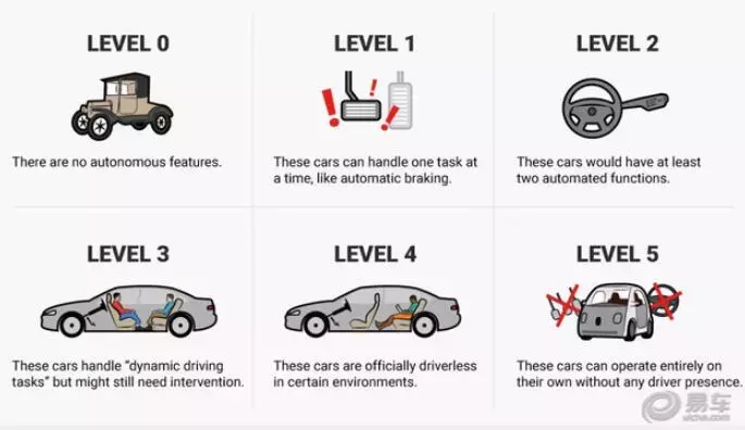 根据国际汽车工程师协会 SAE International在2016年发布的最新的SAE J3016tm自动驾驶分级标准,汽车可因自动驾驶能力的程度不同,分为6个等级分别从L0到L5。
