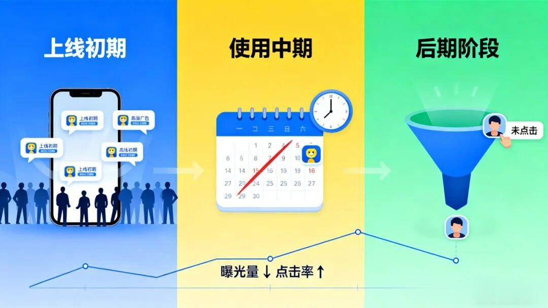 投放时可以根据素材的阶段调整:刚上线时,让更多用户看到,曝光次数可以稍多;素材用了一段时间后,减少重复触达,比如一天最多让用户看一次;到了后期,只给没点击过的用户偶尔看一眼,避免打扰已经没兴趣的人。