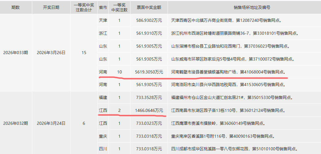 近两期一等奖中奖点明细
