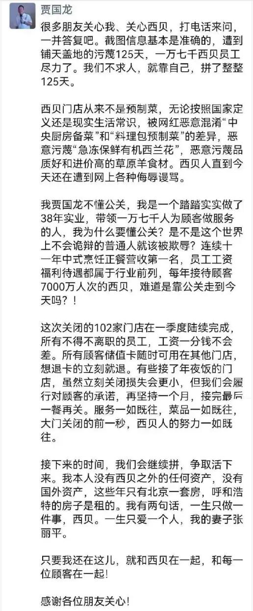 如今东家落难,西贝陷入困境迟迟走不出来,西贝员工也不会丝毫不近人情。关键当初在跟老罗对着干的时候,贾国龙都异常珍惜西贝的羽毛,宁可生意不做也要讨个公道。当下西贝再次遭遇质疑和动荡,贾老板更应该及时站出来,而不是任由事态恶化。
