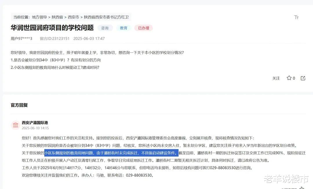 在浐灞国际港的官方2025年6月10日的回应中表示,目前小区东侧教育用地的问题,由于灞桥街村未完成拆迁,不具备启动条件;灞桥街村一期已完成90%,二期拆迁暂无计划。