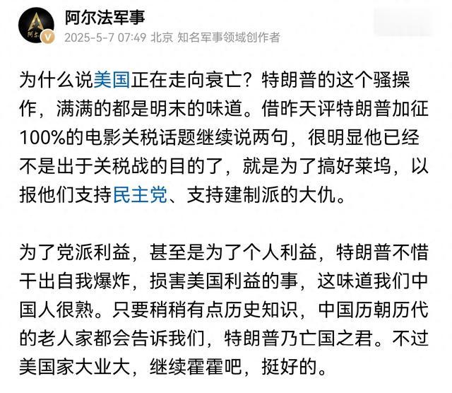 阿尔法认为,美国正在走向衰亡,这从特朗普一系列的骚操作中透着明朝末年的味道可以看出来。前两天,特朗普说要对电影也加征100%关税,平白无故的为啥要加征电影的关税呢?原来是为了打击好莱坞,因为好莱坞一直支持民主党,支持建制派,这些是特朗普的死敌。