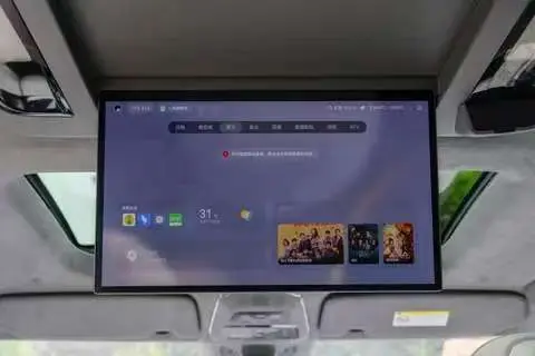 车内的中央位置有一个17英寸的吸顶屏,分辨率是3K的,用的是OLED屏幕,画质很清晰,色彩也比较正。屏幕的角度可以调,有5个档位,从92度到112度之间都能调,不管是坐在第二排还是第三排,稍微调一下角度就能看清屏幕。平时孩子们坐在后面看动画片,不用凑得很近,也能看得很清楚。