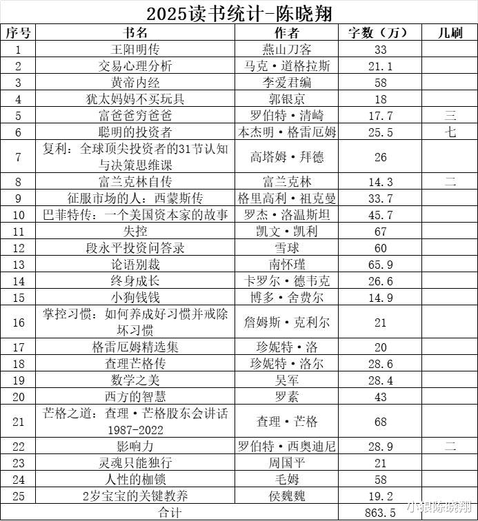 今年在原有读书习惯的基础上,增加了一个小环节。个人觉得非常好,也推荐给大家:每次看完一本书,即刻发微信朋友圈,写明书目、阅读天数、字数、读后感等信息。年底时方便自己整理总结。与此同时,朋友圈也可作为督促激励,增加读书动力,把读书这个好习惯更长久地坚持下去。再高一层,兴许能遇到高度共鸣的读者,大家可以互相探讨长进,既维护增加了朋友情谊,又可能激荡迭代出更伟大的见解思想。除了这个新习惯,再说几个细节。一是感谢妈妈,她单位工会每年都发当当网的读书卡,价值300元。她打小就知道我爱看书,所以每次一发下来就立刻给我。所阅读的书目中,不少就是利用这笔资金购买的,十分感激。昨天又用2026年的卡,精心挑选了8本,预计今天就能送到家,期待感恩。二是我所读的大部分书都很经典,经世典范,穿越岁月长河,历经历朝历代,它们值得反复阅读。今年所读的25本书中,有4本是再次阅读。其中,《聪明的投资者》,读了有记录以来的第7遍。历久弥香,常读常新。要知道,我读书每页都做不少批注。所以读第七遍的时候,上面已经被我批注过七遍。读的是书,读的也是自己读书这些年来的变化。知识量、理解力、心境能量,真的变化很大。而变化的方向向好,这离不开读书这件事。三是家庭阅读文化越来越浓,媳妇2025年读了14本,历史性突破。娃娃还小,才2岁半,但也天天有了阅读的爱好和习惯。很多书中、生活里、工作方面的问题,我们都可以通过经典书籍这个中介,进行探讨解决,着实帮助极大。实际就是这样,这个世界没多少问题,只是我们知道的太少。绝大部分我们常人的困惑解决方案,好书里都总结得相当到位。大量阅读吧,人生会快乐无比。综合这两个数字,反映的是我对人生的思考和态度。身体、健康、物质,是基础;知识、思考、思想,是追求。两相权衡出的生活,就充满了跑步和读书,这两项日常活动,以及今儿产生出的两个“大数”:2247、863.5。最后的最后,祝大家2026年,新年快乐,心想事成!