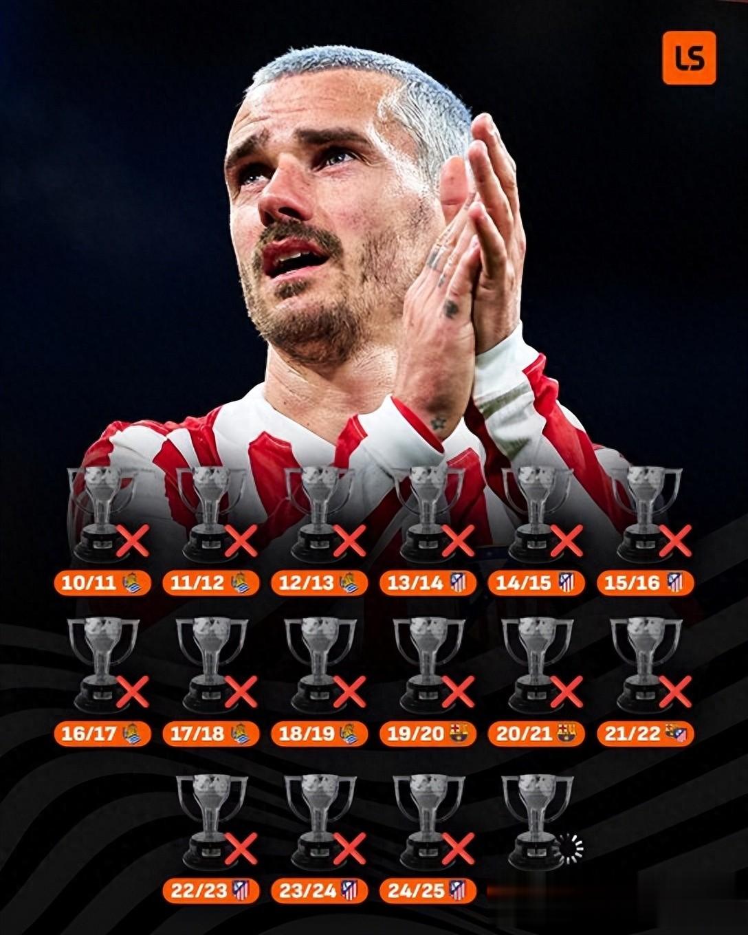格里兹曼的荣誉室里并不贫瘠:大力神杯、欧联杯冠军、西班牙超级杯……他几乎赢得了一切能赢得的,唯独缺了那一座西甲奖杯。他是西甲历史上最高效的前锋之一,是马竞队史的射手王,是那个在场上不遗余力回防、组织、进球的“全能战士”。但正如图片中那一个个刺眼的红色叉号,他在联赛夺冠图谱上,始终处于完美的错位之中。