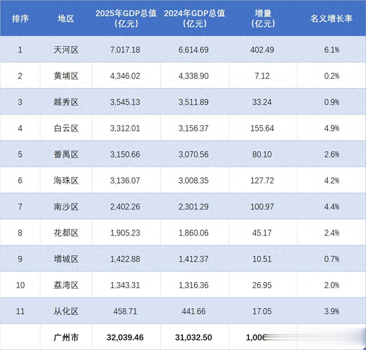 天河区是广州市唯一一个全年GDP总值超过5000亿元的地区,2025年累计金额达到了7017.18亿元,远在其他地区之上,稳居全市之首。不仅总量最高,天河区同比表现亦是不俗,其名义增长率达到了6.1%,高出全市平均不少,在各地之中实为最高,期待2026年能够继续保持住这样的增长势头,为早日跨过万亿门槛奠定坚实的基础。