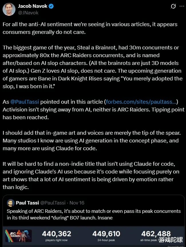 一些从业者也试图用数据来证明这个趋势。前Square Enix高管Jacob Navok以2025年Roblox上的爆款《Steal a Brainrot》为例,这款游戏主要靠AI生成各种奇葩角色,在线人数一度达到2500万,并且持续受到Z世代玩家的追捧。