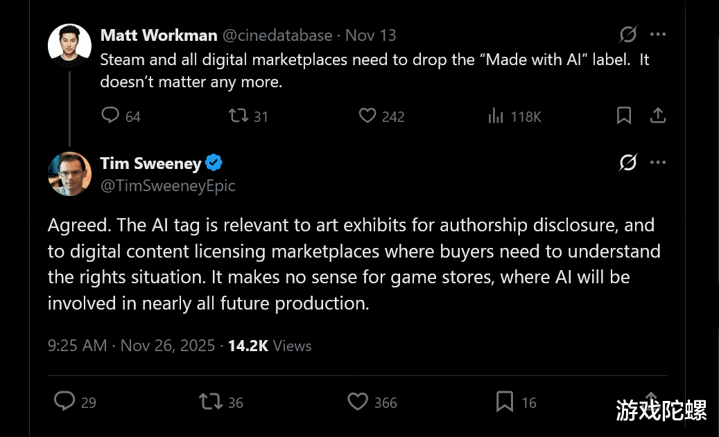 Epic Games 的CEO“Tim Sweeney”也持类似观点。他公开反对 Steam 强制给 AI 游戏“贴标签”的政策。在他看来,虽然在艺术展上标注 AI 有助于明确作者身份,但在游戏商店里这么做毫无意义。“因为 AI 将参与未来几乎所有游戏的制作。”