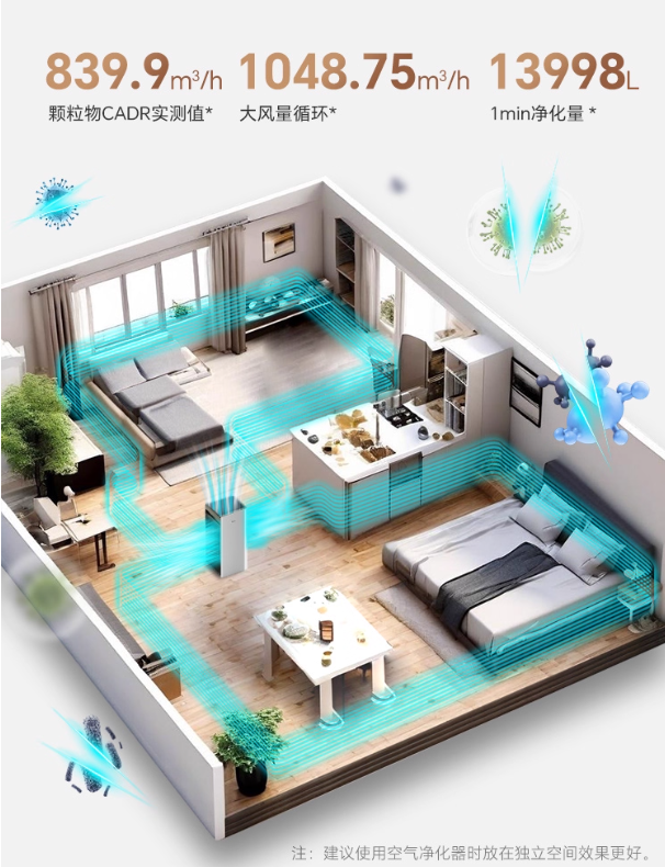 四、全场景适配:不止守护呼吸,更懂宝妈需求除了核心的 “安全 + 净化” 性能,新颐小白 3.0 在使用体验上也充分考虑了母婴家庭的实际需求。首先是净化面积,它的 CADR 值(洁净空气量)达到 839.9m³/h,无论是小户型的母婴房,还是大卧室,都能实现快速净化 —— 实测在 20㎡的房间内,仅需 12 分钟就能将 PM2.5 浓度从 100μg/m³ 降至 5μg/m³ 以下。
