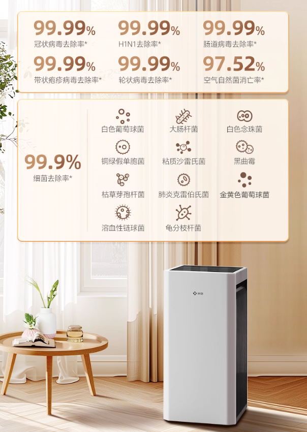 三、99.99% 病毒去除率:构筑母婴房 “健康屏障”宝宝的免疫力较弱,流感病毒、鼻病毒、新冠病毒等常见病原体,很容易通过空气传播引发感冒、发烧等症状。新颐小白 3.0 针对母婴场景的健康需求,在除菌抗病毒性能上做了重点强化,其搭载的 “高效复合滤网” 中,特别添加了抗病毒涂层,能通过破坏病毒蛋白质结构,实现对多种病原体的灭活。