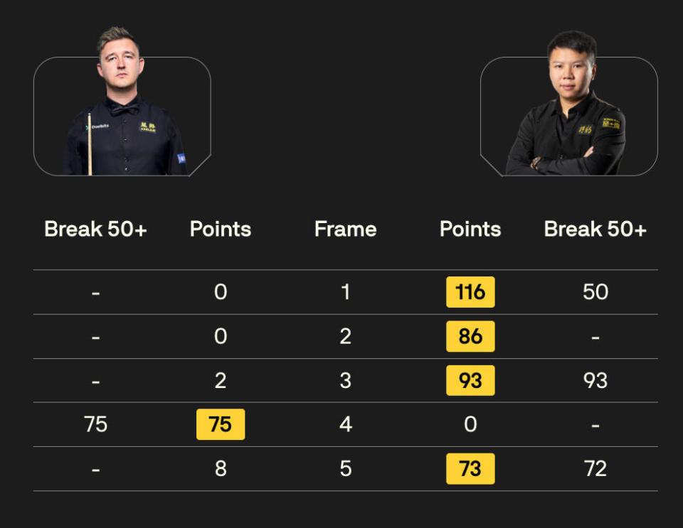 第四局,背水一战的威尔逊终于打出单杆75分挽回颜面,避免了被横扫的尴尬。但第五局周跃龙没有给对手任何喘息机会,上手后单杆72分直接超分,将比分锁定在4-1。
